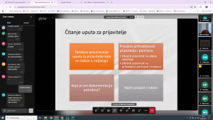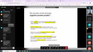 Cilj webinara bio je informirati i naučiti sudionike o važnim koracima u provedbi projekta. Radionicom je stečeno znanje o osnovnim postupcima provedbe projekata iz javnih izvora te su sudionici upoznati s najčešćim pogreškama i teškoćama s kojima se udruge susreću u Republici Hrvatskoj u pisanju i provedbi projektnih aktivnosti. Na radionici bavilo se o bitnim koracima u provedbi projekata – od potpisivanja ugovora, detaljnog čitanja ugovora i objašnjenja dijelova kao što su nabava, izvještavanje i komuniciranje s ugovornim tijelom, načina praćenja i vrednovanja aktivnosti projekta i cjelokupnog projekta.Informacije i smjernice koje su dobivene na webinaru od velikog su značaja za udrugu i primjenjivat će se u budućem radu tijekom prijavljivanja i provođenja projektnih aktivnosti.