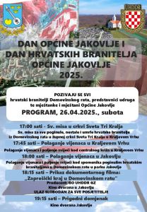 POZIVAJU SE SVI hrvatski branitelji Domovinskog rata, predstavnici udruga te mještanke i mještani Općine Jakovlje da zajedno obilježimo Dan Općine Jakovlje i Dan hrvatskih branitelja Općine Jakovlje.