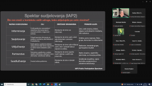Radionica „Modeli uključivanja građana u rad organizacija civilnoga društva“ bila je usmjerena na jačanje kapaciteta organizacija civilnoga društva (OCD) za aktivnije uključivanje građana u svoje aktivnosti, odluke i procese zagovaranja. Cilj radionice bio je pružiti praktična znanja, alate i primjere dobrih praksi koji mogu pomoći OCD-ima da postanu otvorenije, participativnije i povezanije sa zajednicom u kojoj djeluju. Teme koje smo obrađivali su, primjerice, uloga građana u civilnom društvu i značaj participacije, Pregled različitih modela uključivanja (informiranje, savjetovanje, suodlučivanje, suradnja), Alati i metode za poticanje građanske participacije (npr. javne rasprave, fokus grupe, digitalne platforme, građanske inicijative), Izazovi i prepreke uključivanja građana te kako ih prevladati, Primjeri dobre prakse.