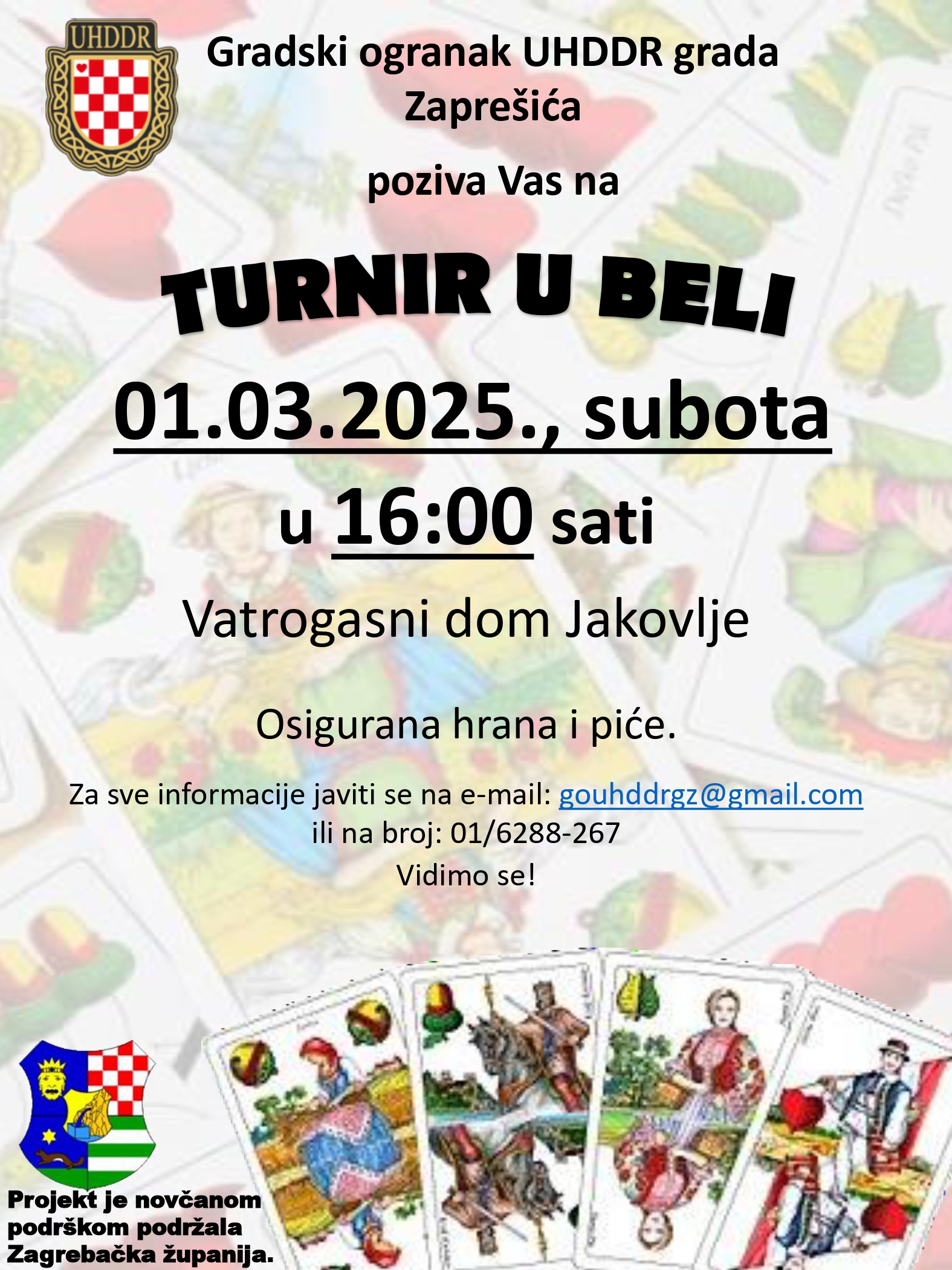 uhddr2025-07-17T06:38:58+00:00TURNIR U BELOTU - 01.03.2025. u 16 sati Gradski ogranak UHDDR grada Zaprešića poziva Vas na TURNIR U BELI 01.03.2025., u subotu s početkom u 16:00 sati Turnir će se održati u Vatrogasnom domu Jakovlje, na adresi: Dvorska 1/a, 10297 Jakovlje. osigurana hrana za sudionike [...]